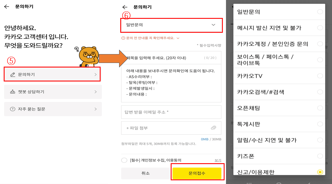 - 2번 : 이모티콘 플러스 상품 또는 톡서랍 플러스, 각종 환불 및 해지, My 구독 서비스 관련